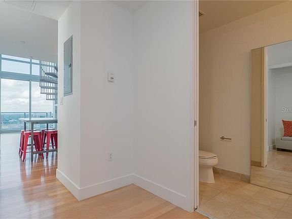 Watch the sunset over panoramic views of downtown Orlando in style from this condo's spacious balcony on the 14th floor. Located in the highly-desirable, luxury condo building, The VUE, this unit boasts a modern living and uncommon conveniences with two-adjacent parking spots and a dedicated storage unit on the first floor of the building. As you enter the loft condo, you'll be welcomed by a bright open space, sweeping views of the skyline, and a show-stopping light feature. The downstairs includes a half-bath, perfect for entertaining or guests, and the kitchen features a gas cooktop and stainless steel appliances. Up the modern spiral staircase, you'll find a large owner's suite with a full bath and substantial closet and laundry area. Enjoy downtown living with ease and sophistication in the highly-appointed building of The VUE. The 7th floor features a state-of-the-art gym, entertainment center, common area, and a gorgeous pool with Lake Eola views. Residents enjoy valet service, building security, dog park, and featured art throughout the lobby. A quick walk across the street leads you to Lake Eola Park, home of Orlando's famous swans, a 1.1-mile walking trail, and the center of community events. If you're looking for style, convenience, and the downtown lifestyle, look no further than this beautiful condo.