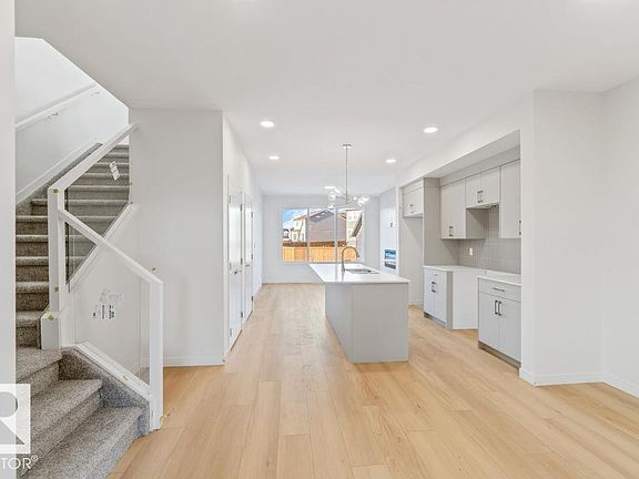 TRIPLE CAR GARAGE, SIDE ENTRY, AND PIE LOT! Welcome to the Metro Nixon 20 by Cantiro Homes! This spacious rear lane single family home is designed to inspire your family in an open concept and bright space. On the main floor, a sprawling open concept features central versatile eating bar for convenient meal prep and easy dining. A large dining room with bright windows overlooking the back yard where parents can supervise the kids playing, and a front porch to lounge and connect with a beautiful community. The upper floor boasts a relaxing primary bedroom, complete with an oversized walk-in closet, and a lavish recharge ensuite, providing a rejuvenating retreat after a bustling day. 2 additional bedrooms, bonus room and upper floor laundry round out the 2nd level. Additional features: main floor flex space, upgraded kitchen backsplash, upgraded iron spindle railing, Brownstone exterior, Birch interior color board.*photos are for representation only, colors/finishing may vary.