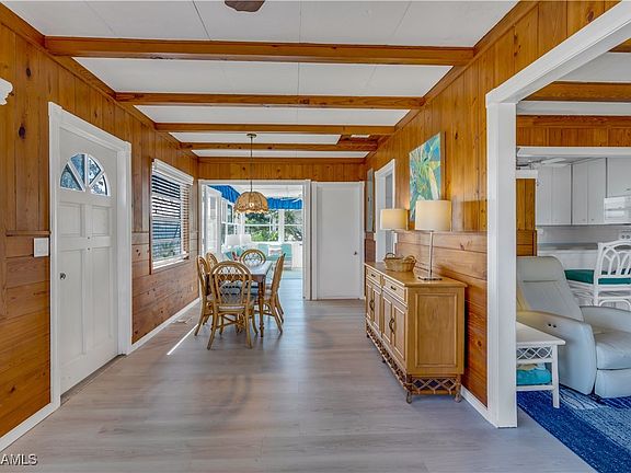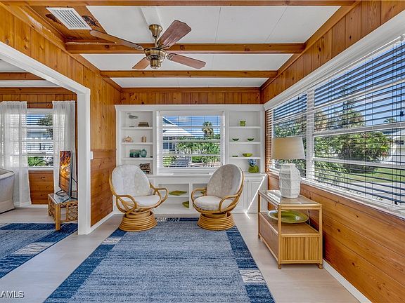 Discover Fort Myers Beach living! This 3 bed/2 bath elevated cottage-style home offers the perfect Florida charm with plenty of space for family and friends to enjoy the island lifestyle. Interior of the home has an open floor plan, lots of windows letting in plenty of natural light, built in bookshelves, and original pine wood tongue & groove walls and ceiling beams. Relax in the large and bright sunroom while enjoying your morning coffee or evening cocktail and walk out onto the deck overlooking the private backyard. Outside, there is a beautiful pool with plenty of space for sunbathing. There is also lots of covered patio space perfect for entertaining. The home offers a metal roof, 2 car under home parking, generous storage, new flooring throughout, updated HVAC, electric and pool equipment. Just steps away from the sugar white sands and turquoise water, the community of Gulf Island Manor offers deeded beach access, a tiki hut, private dock on the bay with boat parking during daytime hours. Perfect mid island location close to Publix, Fresh Catch, Junkanoo and Snook Bight Marina. Whether you're seeking a permanent residence or a vacation getaway, this Fort Myers Beach gem offers the perfect blend of relaxation and adventure.