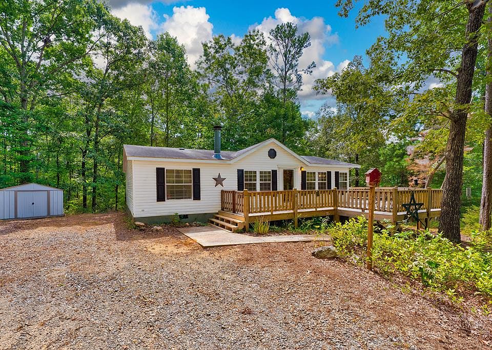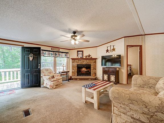 Welcome to this beautifully maintained 3-bedroom, 2-bath residence on a permanent foundation, offering the advantage of easy financing and lasting value. Privately tucked away yet just minutes from downtown Ellijay, this property provides the best of both worlds—peaceful seclusion with convenient access to shopping, dining, and recreation. The inviting interior features a spacious open floor plan, highlighted by a cozy fireplace and abundant natural light. Outdoor living is equally impressive, with a generous deck ideal for entertaining, a charming firepit area perfect for evenings under the stars, and gently rolling, usable land that enhances both beauty and functionality. A small outbuilding adds practical storage, complementing the property's thoughtful design. This move-in ready home is the perfect opportunity for a full-time residence, mountain getaway, or smart investment in the heart of North Georgia.