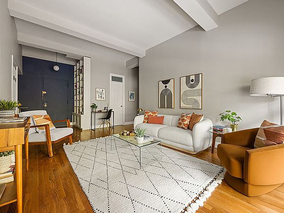 The expansive living room easily accommodates a generous seating area, dining space, and even a home office nook. Magnificent arched windows overlook tree-lined Clinton Street and the landmark façade of the original St. Ann’s Church (now part of Packer Collegiate), designed by the same architects behind St. Patrick’s Cathedral in Manhattan. Morning light pours through these grand windows, and by afternoon, golden sunlight reflects off the church’s stone exterior, filling the space with a warm, luminous glow.