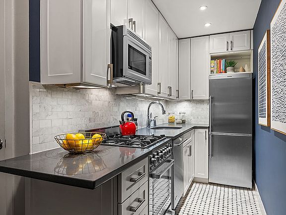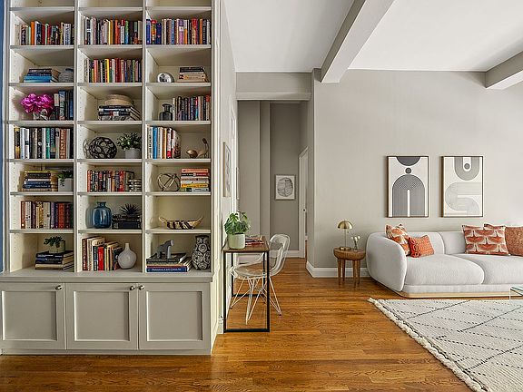 Apartment 2D features a classically renovated kitchen with custom white cabinetry extending to the ceiling, marble subway tile backsplash, sleek stainless steel appliances, Caesarstone countertops, and classic black-and-white marble flooring. Thoughtfully designed for both form and function, the kitchen offers abundant storage and generous workspace, including a breakfast bar. A built-in, floor-to-ceiling bookshelf anchors the entryway—perfect for displaying cherished books and keepsakes—while a deep closet nearby provides convenient storage for outerwear, utilities, and general storage with shelves going up to the lofty eleven-foot ceilings.