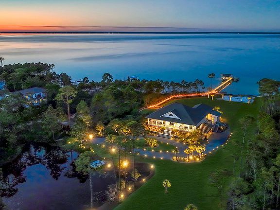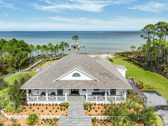 Rare Find! Incredible Estate on the Bay perched on 3.38 acres with 240 feet of Choctawhatchee Bay frontage, this fully renovated 6-bedroom estate offers over 5,700 sq. ft. of luxurious living space and unparalleled privacy. Outdoor living is a true highlight, featuring a brand-new heated pool, spa, and pool deck, plus a 250-foot dock with two boat slips, tropical landscaping, and even a stocked pond with bass and brim for fishing and relaxation. Enjoy complete seclusion with this gated home surrounded by nature while still being just one light away from Scenic 30A and Gulf-front Topsail State Park. The home's Florida room is an enclosed entertainment haven with raised wood ceilings, glass surrounds with panoramic views, added pool bath and seamless access to the new pool deck. Inside, thoughtful renovations and elegant finishes abound. The main level features solid wood cabinets, new porcelain tile floors, shiplap, 10' ceilings, and stone accents. Glass sliders and large Pella windows bring the serene outdoors inside. A chef's kitchen with state-of-the-art Viking appliances, Quartz countertops, wet bar, prep kitchen, and temperature-controlled wine room (holds ~1,200 bottles) is ideal for entertaining. A formal dining area overlooks the Bay with sliders to the Florida room, while a spacious living room features a modern electric fireplace paired with abundant natural light, picturesque views and cozy atmosphere. The first-floor master suite is a coastal retreat, boasting shiplap accents, a sitting area, private lanai with an electric fireplace, two walk-in closets, and a spa-like bath with a clawfoot tub, walk-in shower with four shower heads, and herringbone tile floors. The east side 1st floor bedroom provides a second master essentially with a separate French door entry to the front patio. This room is large enough for two queen beds and offers a beautiful ensuite bath. There is an additional room by the entry with double doors and wood walls that is an ideal office or can be a true bedroom with a bathroom right across. The oak staircase, highlighted by an elegant chandelier, leads upstairs to three additional bedrooms, each with an ensuite bathroom. Two of the bedrooms are Bayfront, each opening onto a spacious balcony with breathtaking views. Ample storage, two laundry areas, and a two-car garage complete the home.