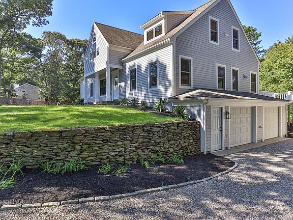 Your Cape Cod dream house waits for you in the lovely village of Cotuit. Close to beaches, ponds, Mashpee Commons, Osterville, shopping, and restaurants yet nestled on a wooded one acre lot on a side street, this home is perfect for the year round or summer resident. On approach, you are greeted by a circular drive leading up to the graceful facade of an elegant home well set back from the road. Directly across the street is Lewis Pond, accessible for fishing, boating, kayaking, and swimming. The home has four large bedrooms including the primary with ensuite on the first floor. The kitchen is updated with quartz countertops, island and plenty of storage and a beautiful dining room with gas fireplace. A living room, family room with fireplace and home office complete the first floor. A full bath is on the second floor with another 3 bedrooms. A finished room with closet in the basement gives the owners yet more options for family and guests while under the home is a two-car garage. Enjoy the backyard with 2 large decks surrounded by woods. Extensive renovations have been made in the last few years. This home was designed for entertainment. Put this on your must see list today!