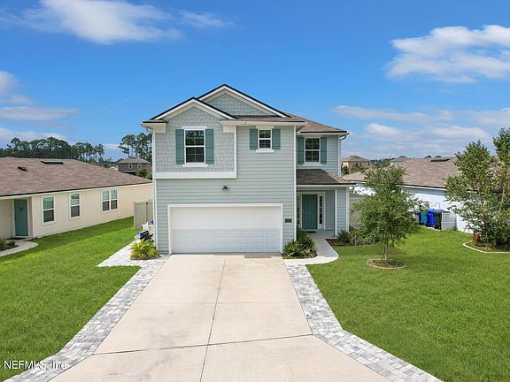 Welcome to Entrada — where lifestyle meets home. This spacious 4-bedroom, 2.5-bath residence includes a versatile flex room on the main level, perfect as an office or theater behind barn doors. Downstairs features upgraded flooring, while upstairs boasts a custom guest bath with a porcelain hexagon-tiled shower, marble accents, and a designer vanity. All bedrooms are upstairs for privacy. The chef's kitchen showcases quartz countertops, 42'' cabinets, gas stove, and a striking black textured subway tile backsplash. Outside, enjoy an extended pavered lanai with a relaxing hot tub, fenced backyard, and serene lake view. The primary suite highlights lake views, dual vanities, and a large walk-in shower/tub combo. Tasteful accent walls add a nice touch. Entrada offers resort-style living with a multi-million-dollar amenity center, two pools, kids' splash park, clubhouse, playground, pickleball, basketball, a dog park, and miles of sidewalks throughout the neighborhood.