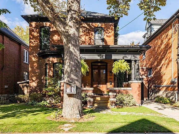 Once in a while, a home comes along that stands apart from the others and 150 Markland is a prime example of this. Built in 1874, this exquisitely renovated home combines historic elegance with sophisticated, modern updates and sharp design choices for the most discerning buyer. The eye candy starts with the gorgeous brick façade and the stately front porch with rebuilt double doors leading into a main floor featuring soaring ceilings, spacious principle rooms and fabulous kitchen with breakfast bar/island. The main floor also offers a 2 piece powder room, laundry room, pantry and a rear addition overlooking the fenced-in back yard. Upstairs are four bedrooms, with the primary bedroom including a private deck, while the finished attic/loft offers versatile additional space ideal for a studio, home office, or playroom. The professionally finished basement has been waterproofed and offers walk-up access to the attached garage. The private driveway and attached garage with ev charger are a unique feature in this historic neighbourhood. The private, spacious backyard includes a large deck, perfect for summer entertaining. Renowned for its historic homes, this sought-after neighbourhood offers quick access to the Bruce Trail, great amenities like Locke Street as well as nearby schools and access to public transit, highways and mountain access. A rare treat and a must-see.