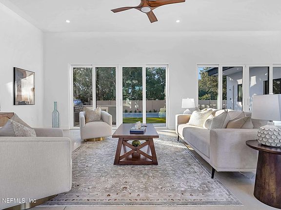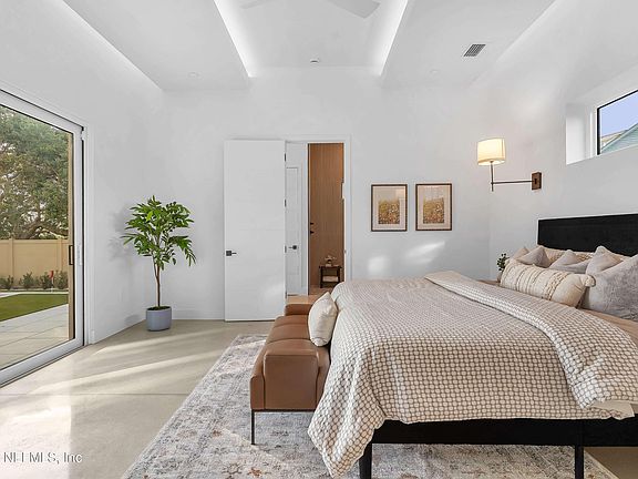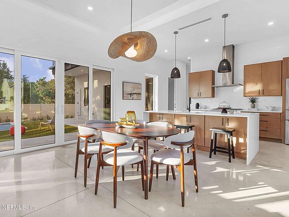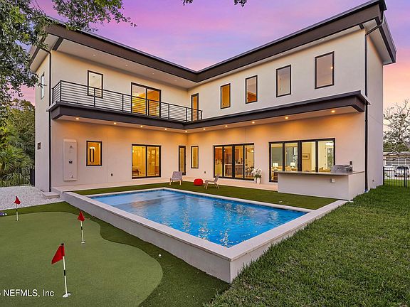 Welcome to 150 Morgan Avenue, a brand new 2025 custom-built modern home located in the desirable Surfside neighborhood of Vilano Beach. This thoughtfully designed residence offers over 3,200 square feet of refined coastal living with 4 bedrooms, 3.5 bathrooms and a spacious 2 car garage. Situated on a quiet dead-end street with no HOA, the property offers privacy, serenity, and marsh views. The home features two luxurious primary suites, one on the main floor and one upstairs, ideal for multi-generational living or guest accommodations. High-end finishes include concrete floors downstairs, engineered hardwood floors upstairs, and a premium stainless steel Bosch appliance package in the kitchen. Hurricane impact windows and doors provide security and peace of mind. Outdoor living is a highlight, with a heated saltwater pool, private putting green, summer kitchen and an outdoor shower, perfect for entertaining or relaxing after a day at the beach.