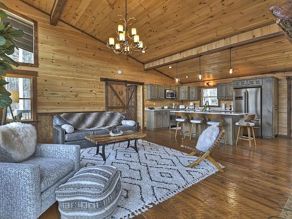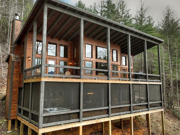 Modern Mountain Magic! With breathtaking unobstructed long range mountain views, this absolutely stunning 3/3 property will melt your stress away. Built in 2020 with end of the road privacy and two oversized decks to take in the amazing Blue Ridge mountain sunsets, it is being sold completely turn key with designer touches throughout including upgraded lighting and ceiling fans, three fireplaces, Tahitian cream quartz counters, hand sawn kitchen cabinets, stainless Italian appliances, barn doors, farmhouse kitchen sink, vessel bathroom sinks, enclosed master bathroom walk-in shower with 6 foot soaking tub, custom made bunk beds inspired by the Blue Ridge Scenic Railway and on it goes! Wait until you see the massive screened party porch with wet bar, hot tub, fireplace, upgraded outdoor patio furniture, and custom made hand sawn rough edge bar and dining room table. It truly has to be seen to be believed! The property has been lovingly maintained and gently used as a 2nd home and never rented. It also offers easy access to Blue Ridge, McCaysville, and Ellijay. A perfect mountain oasis awaits. Schedule your viewing now!