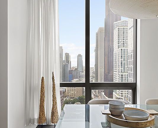 • Corner living / dining room with a wall of floor-to-ceiling windows looking Southeast, 25 floors above Flatbush Avenue.