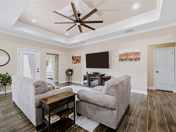 Featuring decorative tray ceilings and wood-look ceramic tile throughout, this home blends comfort with style. Large windows fill the space with natural light, highlighting the spacious open-concept floor plan. Even the storage shed has charm—it’s cute enough to finish out into a cozy “she/he shed.”