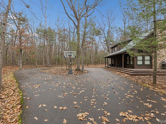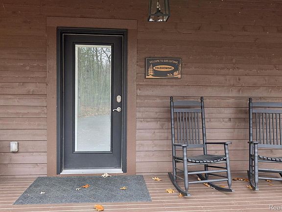 Discover your own private retreat on 5.8 serene acres. This secluded 3-bedroom, 2-bath home features stunning vaulted ceilings, rich wood floors, and a grand stone fireplace that anchors the open-concept living space. The kitchen offers granite countertops, stainless steel appliances, a butcher block island, and plenty of workspace—perfect for everyday living or entertaining. The spacious primary suite includes a beautifully appointed bathroom with a double vanity and a walk-in shower. Enjoy peaceful mornings on the covered front porch, or unwind in the tranquil wooded backyard complete with a fire pit for cozy evenings under the stars. A spacious pole barn provides exceptional storage or hobby space. This is the ideal blend of comfort, privacy, and Northern Michigan charm—your getaway awaits. Partially Furnished - Deeded Boat Dock access
