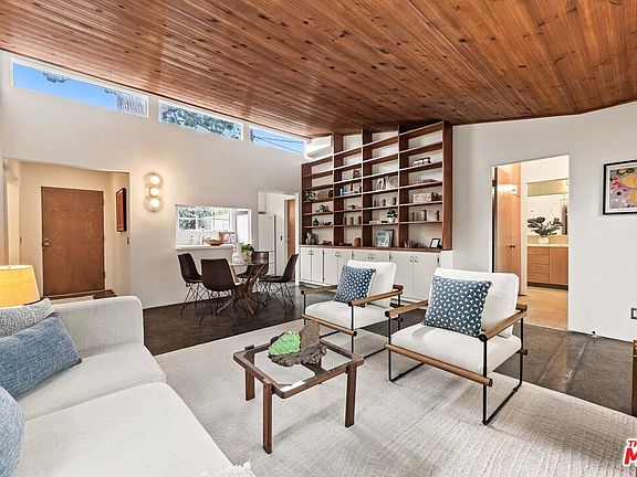 Nestled beneath a canopy of majestic Italian Pine trees this Mid Century Modern located in the Media District offers the perfect blend of privacy, charm and convenience. Gated and surrounded by tall shrubs you are immediately drawn to the architecture of this period home with its original Redwood siding. Enter under the wood canopy through the orange door to find concrete floors, vaulted ceilings and clerestory windows allowing light to flow through the space. A custom modular wood bookshelf in the living room offers effective storage and a place to show off your latest collections. The kitchen offers an open space to prep and entertain with ample cabinet storage. The primary suite is a newer addition to the original home keeping to its design roots. With ample room for a king sized bed, this wing offers updated closet space and a spa-like dual shower experience in the beautifully tiled bathroom. At the other side of the home find two bedrooms, nicely appointed with transom windows and a shared bath. Outdoors there are multiple spaces to entertain with a Viking BBQ, string lights and rear gate entry option. Parking for two cars with a newly installed 220v EV charger. Come check out this gem with design elements not often offered at this price point. Amazing central location to the Studios, Whole Foods Market, Commissary Coffee, A&O liquor and great Burbank dining options.