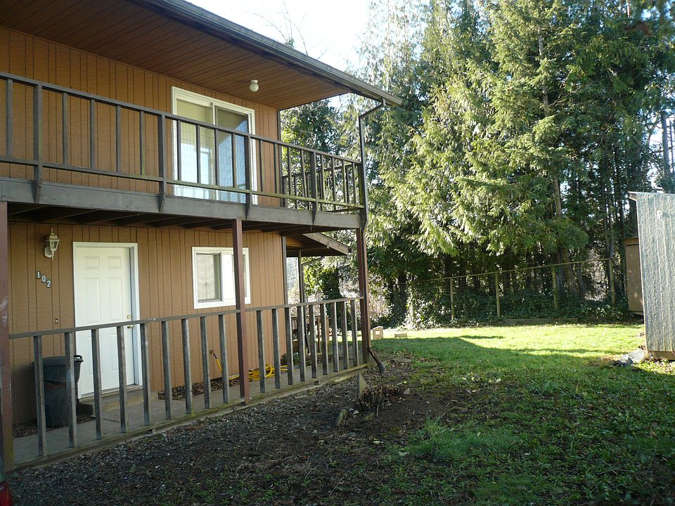 Back deck and covered front porch. Partially fenced shared yard. Space for garden and flowers. Shared lawn care. Shed. Quiet.