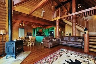 We welcome you to enjoy our custom log cabin home (sleeps 6) complete with metal roof which is the color of oxidized copper. We have 3 bedrooms and a sleeping loft, 3 full baths, hot tub, sauna, game loft, two decks with beautiful views, professionally decorated modern kitchen, newer electronics, linens, bedding, rustic real log furniture, etc.
