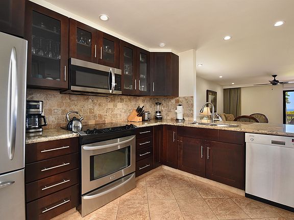 If you wish to purchase a beautifully upgraded, Ground Floor, Corner Unit, look no further. The location of this family cherished second home, is unparalleled, and includes drop- dead gorgeous views of the crystal-clear Pacific Ocean, featuring the Friendly Isle of Molokai as a backdrop. The family has owned this property since the 70’s, and renovated it as a private second home for themselves. The improvements are superb, and include an Open Floor Plan, with the kitchen, sharing the spectacular ocean views with the Great Room, and Main Suite. The is tiled throughout, has renovated baths with custom cabinets, showers. New appliances have been added recently. The windows have all been replaced. The second bedroom also is an on suite with very private, and quiet location in the rear of the apartment. The unit is being sold furnished, and turn key. Some of the artwork may not be included, as the seller, and her mother painted them. The Kaanapali Plantation is located on the world famous Royal Kaanapali Golf Course. 10 Acres are graced with mature tropical trees, flowers, and plantings. Also included is a swimming pool, a cabana, tennis court, and shuffle board. There are 62 units, consisting of 1 bedroom 2 baths, 2 bedroom 2 baths, and 3 bedroom 2.5 baths. Another tropical touch, is that the buildings are 2 stories, so the views are optimized, while keeping a low density highly desirable place to call home!, This unit is in an active Vacation Rental Program, and we might be able to see if the guests would allow us to view the unit, if it occupied when you want to view it. Otherwise, it will only be available to show between check-ins. The Aluminum Roof has been installed in many buildings, and is scheduled to be completed soon. This fantastic piece of Paradise is precious, as it makes you feel as if you’re in Plantation Days on Maui.