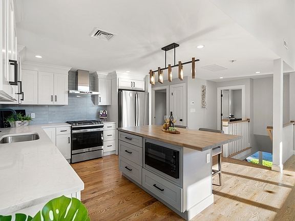Come and see this stunning 2022 transformation! Located in the highly sought-after Morningside neighborhood, this 4/5 bedroom completely renovated Raised Ranch is a gem! Enter into the first-floor foyer and mud room and you'll find a beautiful versatile room with a slider to the side yard. Use it as a second primary bedroom, nanny/teen/out of town guest space, family room, or a private home office. Head up to the main level with its open floor plan featuring a living and dining room with dramatic cathedral ceiling with slider to a maintenance-free deck, and fabulous Chef’s kitchen with white cabinets and quartz countertops, subway tile backsplash, stainless steel appliances, and a large contrasting center island with pendant lighting. Completing this level are four bedrooms, including the primary with a gorgeous ¾ ensuite bath, and a full family bath. Walking distance to the Bishop/Stratton Schools, and close to the Bike Path, Arlington Heights and Center shops and restaurants!