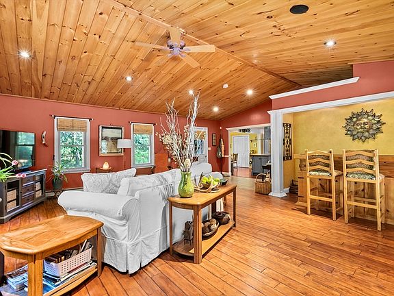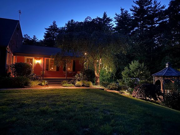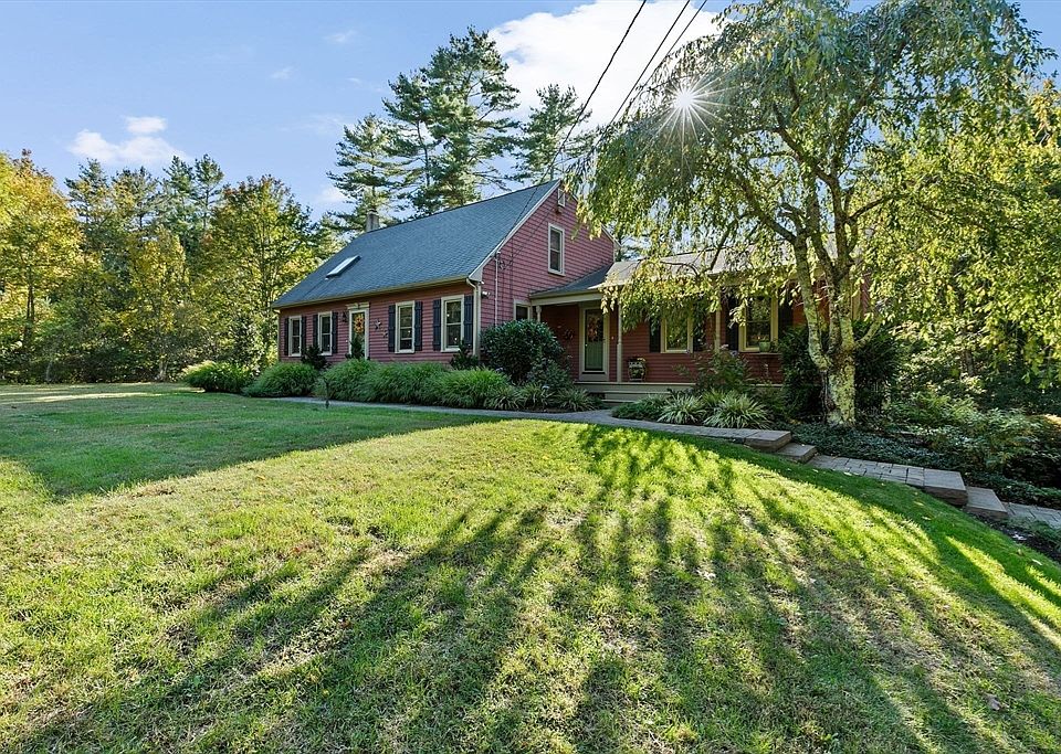 Situated between two communities, this corner lot home offers seclusion and peacefulness surrounded by trees and nature. The living room welcomes you with its rich wood vaulted ceiling, creating an atmosphere of spaciousness and warmth, all while the free-standing gas fireplace adds warmth and coziness instantly. French doors open to the covered deck overlooking the spacious secluded yard with mature landscaping. Imagine relaxing in this inviting space, where natural light dances across the unique architectural details. The kitchen delights in its custom designed island with maple butcher-block top, range hood and stovetop, stainless appliances, and stone countertops Bonus space in basement. So many additions: Culligan water treatment system, irrigation, Aerus central vacuum, Hot Springs Salt Spa, built in bedroom cabinetry. Lots of storage throughout. Six miles to the major shopping center, a short distance to Rte. 495 and 195. Town beach rights to Silvershell Beach 10 miles away.