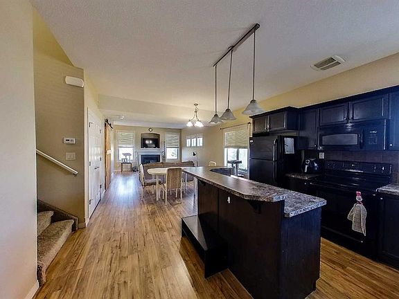 This end unit townhouse is perfect for first-time home buyers, downsizers, or busy professionals, offering enough space and style for their liking. Come inside and enjoy the open concept main level featuring a stylish kitchen with ample cabinetry, 9' ceilings, a large island with a breakfast bar, and vinyl plank flooring and a large pantry. There is plenty of room for you to dine and enjoy the abundance of natural light. The washer and dryer are located in the storage room on the main floor. Enjoy the gas fireplace in the large living room. There is a 2 piece bathroom on the main level, located near the door to go out onto the 10' x 10' deck area. The 10' x 20' yard is fenced and you can leave through the back gate and enjoy the green space to the North. The upper level has 3 bedrooms ( primary bedroom has a walk in closet ) and a 4-piece walk-through bathroom. The basement is unfinished. This professionally managed condo association handles snow removal and even mows your grass in your fenced yard. This home is in a quiet area and it is just waiting for its new owner.