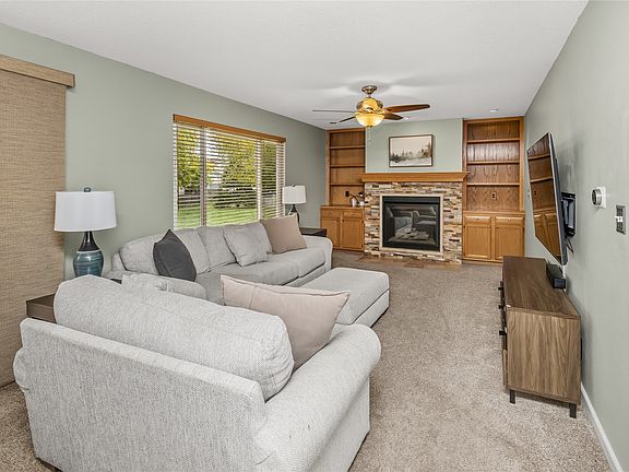 The open-concept main floor offers seamless flow between the living room and kitchen, featuring stainless steel appliances and plenty of cabinet space. The spacious family room showcases a stone-surround fireplace with custom built-ins, perfect for cozy nights at home.