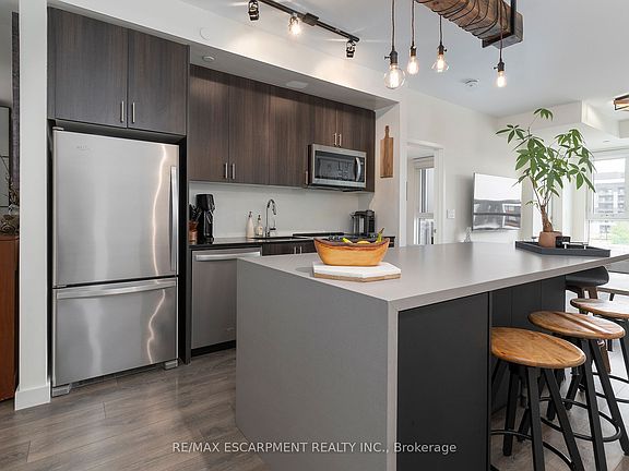 This beautifully designed home offers a great layout and plenty of space and exudes natural light with the west facing location. The open concept living is ideal for entertaining family & friends. The Kitchen is the ultimate WOW factor offering S/S appliances, modern cabinets and an amazing large custom island offering plenty of seating and storage & art piece style light fixture above island. The spacious bedroom offers black out blinds offering you a great nights sleep. This unit also offers a bonus den, the convenience of in-suite laundry w/new front loading washer/dryer combo and a modern 4 pce bath. This great unit also offers a covered balcony to enjoy your morning coffee or evening wine. Added features to make this an even more comfortable and convenient living space are the blinds on all windows and doors, upgraded dimmers on the light switches that can be controlled through Alexa & Google & updated closets. You can save on a gym membership with the nicely equipped in-house gym, locker for all your storage needs, not all units offer this great feature, bike parking, underground parking, party room & media room. Need another reason to call this one HOME it is the Uptown Oakville location close to all highways, public transit including the Go and ALL other amenities