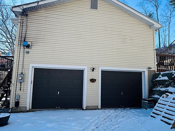 Right on the Mass and RI line sits this SPACIOUS Ranch with NEW 10 x25 CONCRETE PATIO, freshly painted 26 x 10 DECK to enjoy your SPRING evenings and a 12 x 10 DECK in the back of home. Sits on 3.18 PRIVATE acres (land is hilly but NO neighbors in back or to the side!) TILED entryway leads to BEAUTIFUL HARDWOOD floor in Living room with pellet stove (CONVEYING) OPEN to LARGE TILED, APPLIANCE kitchen (newer counter) and ISLAND-$2000 CREDIT for island top and plenty of space for your table and new cabinets added for extra storage. HARDWOOD floors in hallway and PRIMARY bedroom w/ walk in closet, bathroom has JETTED tub and TILED floor. Additional bedroom w/ HARDWOOD floor and another w/ carpet with a FULL bathroom in hallway that has TILED flooring. NEED more space? there is 850 ft in lower level that some framing has been started for extra sq ft. WALK OUT to 2 GARAGES with BRAND NEW BROWN DOORS $ 3000 in 2024 (NO OPENERS). FURNACE cleaned 10/25, in 2025 8 x 10 chicken coop built $2000 could be used for storage shed. 2025 holding tank too, 2015 ROOF!