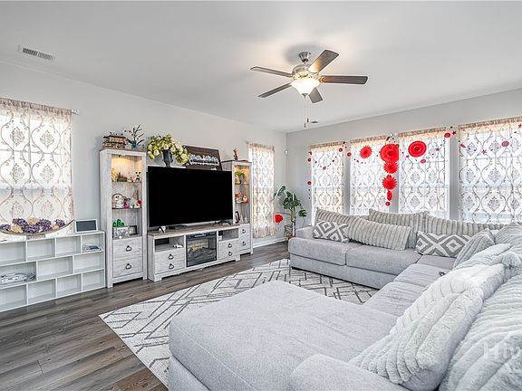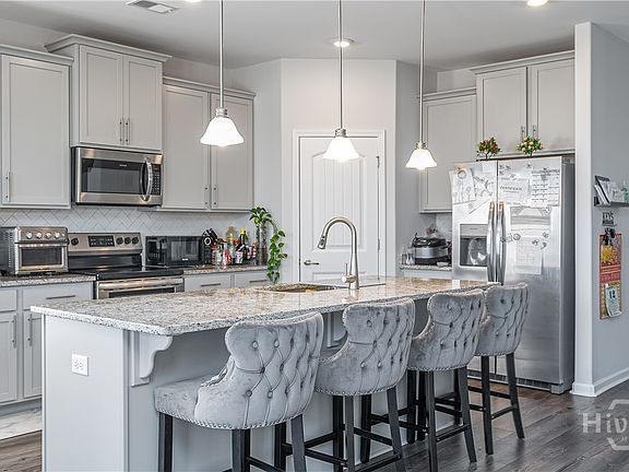 The open-concept layout features a sunlit family and living room with abundant windows. The upgraded kitchen offers granite countertops, a center island, 42" cabinets, stainless steel appliances, and a stylish tiled backsplash.