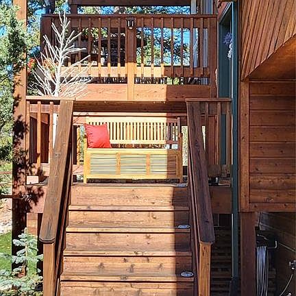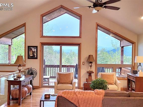 Views, Views and more views showcase this well-maintained FURNISHED 3bedrooms/3bathrooms home on approx. ¾ of an Acre. South facing and built in 2005, the property is located just outside Woodland Park City Limits - making it allowable for Short Term Rental options. The main level is enveloped in an abundance of natural lighting and boasts natural Walnut floors. The open concept living room, dining room and kitchen make entertaining for family or guests seamless. Relax and enjoy watching the light change on the unobstructed full views of Pikes Peak from every one of these rooms or the expansive outdoor covered deck. Cozy up in the living room in front of the gas log stone fireplace. The kitchen is a discerning chef's delight equipped with large triangular island, bar, Wolf Stove, double stacked Fisher/Paykel dishwasher and Wolf drawer-type microwave. Outdoor lovers can enjoy the walk-out backyard slate patio area with natural gas heater connection, natural gas bar-b-que, green house, tree house and play fort. Follow the Walnut floors down the hall to a well-appointed en-suite master bedroom with adjoining bath, oversized shower with 6 shower heads, bench seating, heated tile flooring, double sink vanity, and linen closet. 2 additional bedrooms and a 2nd bath located on the main floor as well. The lower level includes an inviting walk-out level family room, pool table, 3rd full bathroom and laundry room. From the family room, walk out to relax in a saline hot tub spa to enjoy all that the property has to offer. (Note: Pool Table area could easily be converted to a 4th bedroom.) A 2 car attached garage plus a bonus 1 car detached garage and additional work shed w 50 amp electric allows for plenty of storage space and room for the work at home and DIY enthusiasts. All move in ready for you!