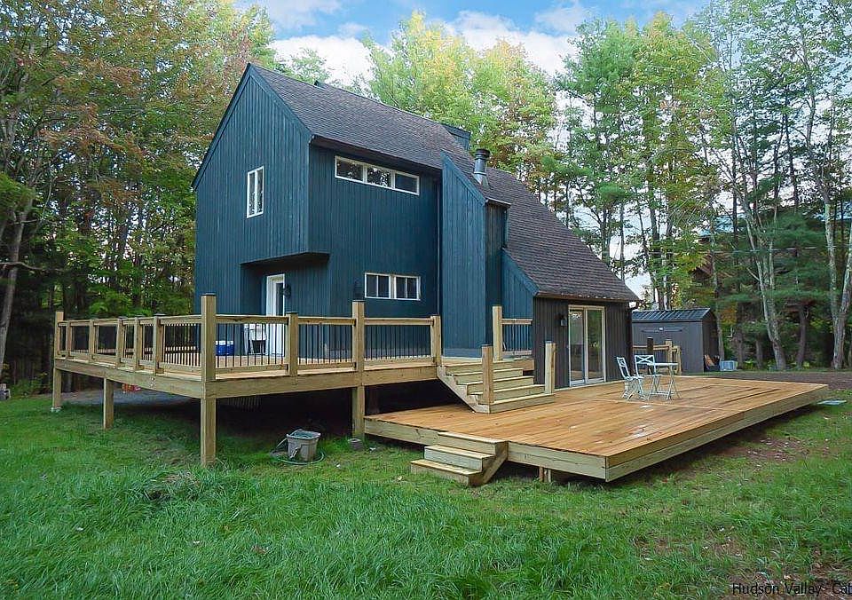 This beautifully renovated contemporary mountain retreat awaits you. Renovated down to the studs, including updated electric, and nestled on 1 acre of lush lawn, this home offers a total of 2,182 sqft of living space including a sunken great room with beautiful fireplace and vaulted ceiling. A well-equipped kitchen/dining area features modern cabinets, a suite of new stainless-steel appliances and direct access to the brand-new tiered decks with modern metal railings. Calming earth tones and wood accents throughout the home make the perfect rustic/modern marriage. The first and second floors offer three bedrooms with custom sliding barn doors and two tastefully tiled full bathrooms. The finished basement lends itself to a family room or rec room, office and laundry area. The finished basement has been considered in the overall sqftg. This beautiful abode is located 2 miles from The Windham Mountain Resort and 100 miles from NYC making it the perfect weekend getaway for personal use or a profitable vacation rental. Enter into contract now and enjoy the upcoming holidays in the peaceful Catskills Mountains.