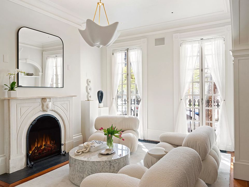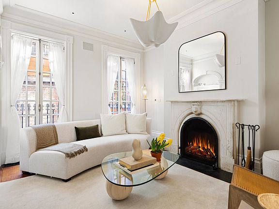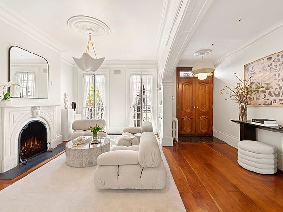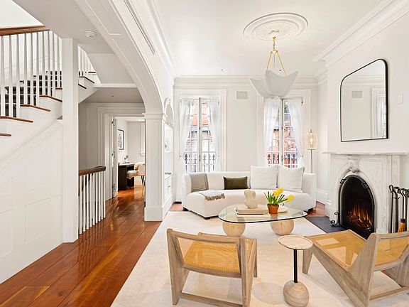 A rare gem situated in the Greenwich Village Historic District. This exquisite home, originally built in 1836, sits on one of the most cherished blocks in the West Village. No detail was spared during the extensive restoration. The 19'-wide landmarked Greek Revival has been artfully restored using classic traditions and quality materials to last for centuries to come. It features a highly desirable private garden exuding the old world charm of a European villa, complete with antique fountain, lush greenery and space for alfresco dining. Additional details include antique brick, solid cherry wide-plank hardwood flooring, and newly fabricated ironwork to create one of the loveliest homes in New York. GARDEN LEVEL The Garden level is highlighted by a magnificently designed gourmet kitchen and dining area that opens to a sunlit garden terrace. Design features include a wood burning fireplace; custom cherry wood cabinetry and paneled millwork; door, window, and cabinetry hardware made to order by the P.E. Guerin foundry in the West Village; and timeless fixtures, in polished nickel, forged by Lefroy Brooks. Custom patio doors open to the stone terrace, equipped with a barbecue for grilling and a lovely space for outdoor dining and enjoyment. Additionally, there is a ¾-bath on the Garden Level which serves as a powder room. PARLOR LEVEL After being welcomed through the stately front door, you pass through a dramatic arch into an expansive, graceful living space featuring high ceilings and elegant, crown molding. Additional features include two wood burning fireplaces with period marble surrounds, custom bookcases, wide plank cherry hardwood flooring, and tall windows allowing abundant light. The rear windows open to quaint Juliette balconies with views to the terrace below, and an office space on this level is perfect for any workday set up. THIRD FLOOR This floor offers two handsomely proportioned bedrooms, both with beautiful light and views through large windows. The north facing bedroom features three windows and a gas fireplace with antique marble surround. These rooms are complemented by a striking bathroom with a separate water closet, large soaking tub and vanity. FOURTH FLOOR Dedicated solely as the primary master suite for ultimate privacy, this grand bedroom features three glorious north facing windows, marble gas fireplace, custom paneled millwork, and generous space allowing a California king bed and seating area. The en-suite primary bath is a glamorous sanctuary, featuring a large soaking tub, separate marble-slab shower with steam option, dual vanities, water closet, and towel warmer. A skylight original to the home is complemented by custom transom windows with privacy glass that grace the tub. LOWER LEVEL The lower level has been finished as the perfect space for a den, TV lounge, workout space, game room or playroom. Featuring custom, maple wood cabinetry for storage, and a dedicated A/V mechanical cabinet. Adjacent is a separate, large laundry room with custom storage cabinetry and utility closet. 150 West 11th Street stands alongside single-family townhouses with trees and flower beds gracing the sidewalks. The home is in the heart of the area that comprises New York's early cultural history, where many famous restaurants, bars, and bookstores are landmarks. It is near fashionable shops on Bleecker Street and some of the best restaurants, such as Via Carota, Dante, L'Artusi, and many more, that will leave you with endless options to explore. With deep roots of cultural history mixed with trendy hot spots and elegant boutiques, it is the place to live. In 2007, the home was presented on the prestigious, benefit house tour held annually by the Greenwich Village Society for Historic Preservation.