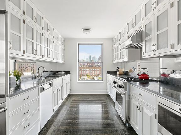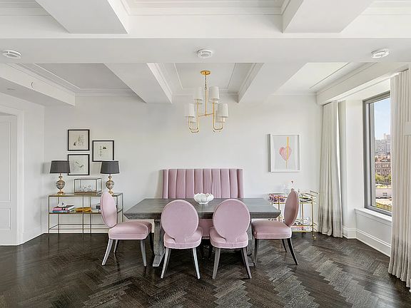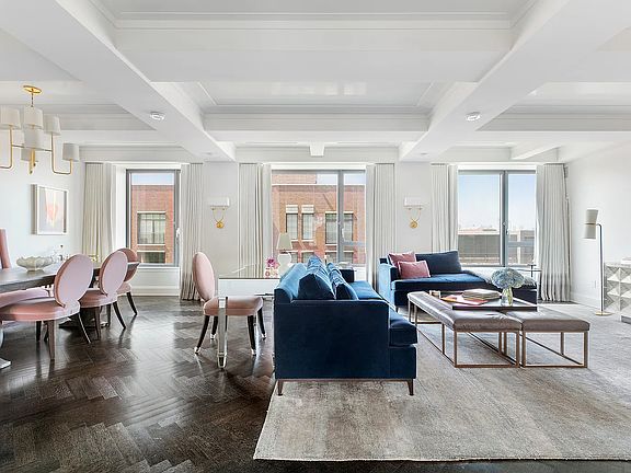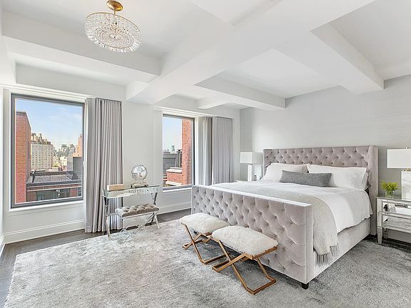 Located in world renowned Greenwich Lane Condominium on the 9th floor with soaring open city views over a picturesque tree lined Greenwich Village Street, comes this meticulously designed and pristinely kept, spacious and fully furnished designer 2 bed, 2.5 bath home. Residence 9W is a floor-through apartment boasting grand proportions, open city views and is the epitome of sophistication. This specific unit is privately set in the western part of the building allowing for quiet and peaceful living day to night with rare North and South exposures. Conceived by Thomas O'Brien of Aero Studios, in collaboration with architect FXFOWLE, this thoughtfully designed space consists of beamed ceilings, classical millwork paneling, and gorgeous oak hardwood floors in dark espresso finish. Once you step through the foyer, you are immediately drawn to an expansive layout with over 2,000 sqft of open and airy living space. The formal living and dining rooms are approximately 28 by 19 feet with dark stained herringbone hardwood floors and floor-to-ceiling glass windows with an open Southern exposure and views of Lower Manhattan. Adjacent to the Great Room and neatly tucked behind a pocket door is the windowed Chef's kitchen complete with Soapstone counters, mirrored backsplash, Waterworks fixtures and Sub-Zero and Wolf appliances as well as unobstructed Northern views of the Empire State building and the Midtown Skyline. Situated down the hall is the private, corner primary suite with large, south-facing windows, two walk-in-closets, and an exquisite primary bath with custom millwork vanity, under-mounted soaking tub, marble mosaic floors and a separate glass-enclosed shower. The second bedroom is large with two windows and an ensuite bathroom. The Greenwich Lane is in the ideal West Village location. Moments from the Hudson River Park, The Highline, the Meatpacking District, Pier 55, The Whitney, fresh farmer's markets and world class shops and cafes. This is downtown living at its best. The Greenwich Lane is a LEED-certified new development that truly embodies luxury living in the middle of The Village. Impeccably designed and artfully crafted, these homes span nearly a whole city block between Twelfth and Eleventh Street off Seventh Ave and offer state-of-the-art amenities never before seen in Greenwich Village. Some of which include a central garden, spacious residents' lounge, dining room with guest chef's kitchen and separate catering kitchen, 25-meter swimming pool with hot tub, full fitness and wellness level with yoga and treatment rooms, golf simulator; spacious 21-seat screening room; a light-filled children's playroom; bicycle and private storage; and several 24-hour attended lobbies and professional courteous service.