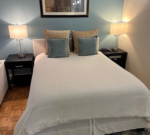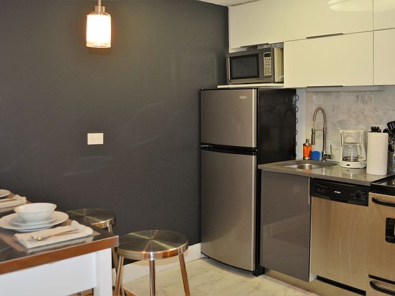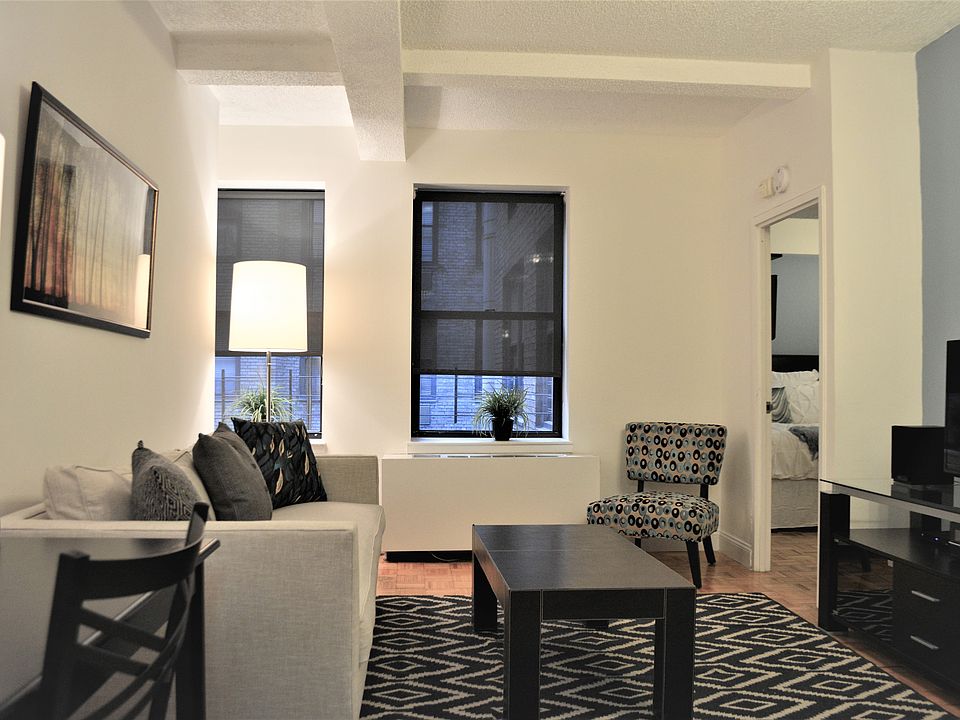 No Broker Fee! This renovated fully furnished one bedroom residence sits on an inner courtyard offering peace and tranquility in the middle of midtown Manhattan. The entry foyer leads to a separate dining area with a modern Pullman kitchen featuring white lacquered cabinetry, grey Caesar stone countertops, white marble flooring and backsplash, and all stainless-steel appliances. The grey chalkboard accent wall gives the kitchen a sophisticated but playful look.