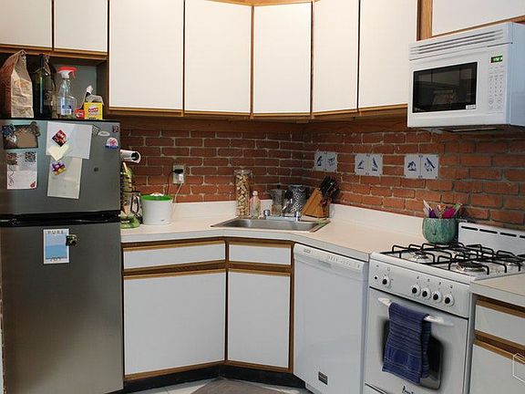 Location, Light & 12' Ceilings! Note: This is not a ground floor apartment - it is located one flight up. Available July 1, 2018. Welcome home to your large, serene, light-filled 1-bedroom in the absolute best part of the Upper West Side. With the apartment's 12' ceilings and large, south-facing windows, you'll get amazing light and openness, and its location in the back of the building overlooking a landscaped garden ensures pin-drop quietness and zen. The kitchen includes a dishwasher and an added dose of character with its brick wall backsplash; it opens to an oversized living and dining area, which could also be used for a home office. The bedroom also overlooks the garden for a peaceful night's sleep, and it easily accommodates a queen-sized bed with room for nightstands on each side. Beautiful hardwood floors throughout. Pets: Cats ok, no dogs. 150 W 74th St is a post-war rental building located in the most convenient and vibrant part of the Upper West Side. It includes laundry and bike racks in the basement and a new intercom system for added security. You truly can't beat the location: 1 block to the express 2/3 subway; 1.5 blocks to Central Park; Trader Joe's around the corner; and Levain Bakery on your block!