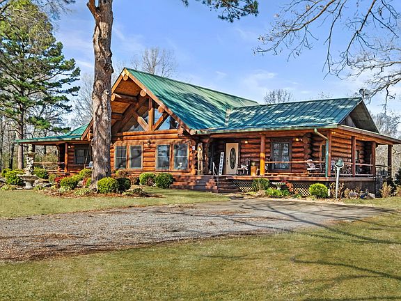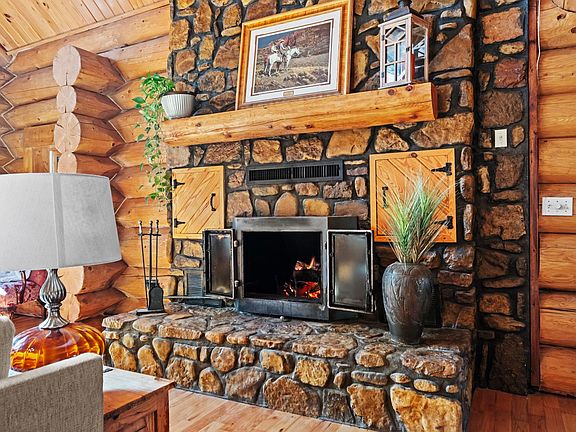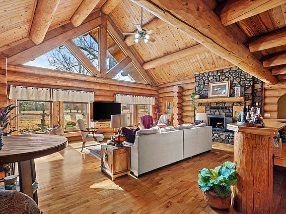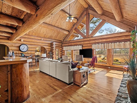 Stunning 3,118 sq ft custom log home on 9.62 beautiful acres, constructed from Engelmann Spruce grown in Canada and originally crafted in Colorado. The logs were carefully relocated and professionally assembled on site, offering timeless appeal and exceptional attention to detail.The main living area features vaulted ceilings, exposed log beams, natural wood finishes, and a massive stone fireplace plumbed for propane or wood burning. The home is also plumbed for propane gas and offers 3 bedrooms plus a spacious loft used as a 4th bedroom/office with built-in closets, 2 full baths, and 1 half bath.The kitchen has been updated with granite countertops and new appliances and includes a storm shelter just off the kitchen for easy access and added safety. A wraparound porch spans approximately three-quarters of the home and overlooks a private pond and peaceful acreage. Enjoy abundant wildlife, a private drive, large deck, above-ground pool, and ample storage. An oversized 2-car garage includes extra shop/ storage space.This exceptional log home offers privacy, natural beauty, and a tranquil lifestyle with room to gather and entertain. Mineral rights negotiable with suitable offer