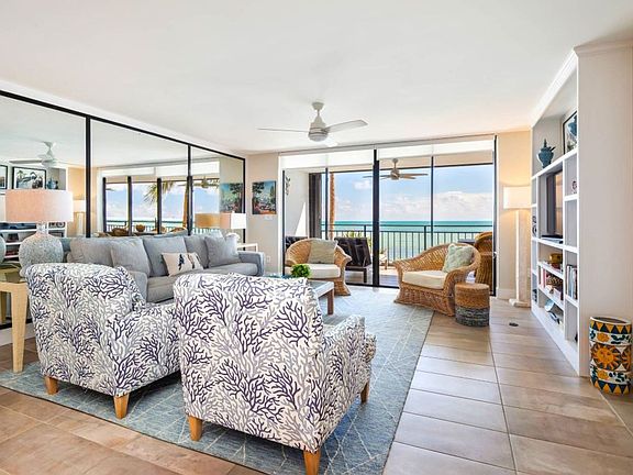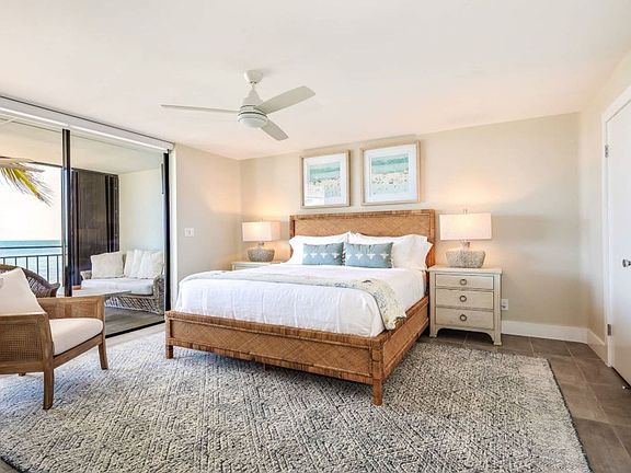 The living room is accented in aquatic colors with an abundance of seating as well as a wall of sliders leads to the covered, oceanfront balcony with a table for alfresco dining, large sofa, and loungers. The primary king bedroom opens to the balcony where you can enjoy morning coffee while listening to the sounds of the sea.