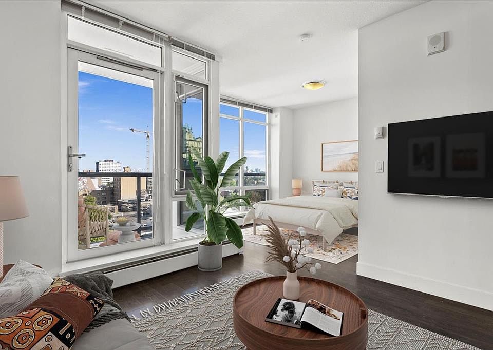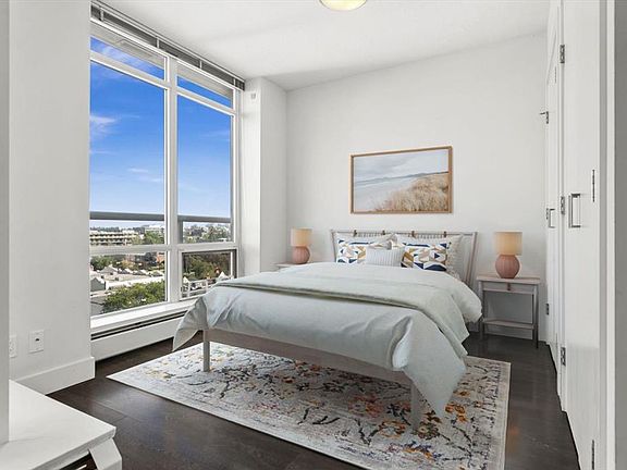 Floor-to-ceiling windowsSleek kitchenQuartz countertopsDedicated dining areaSpacious sleeping areaDouble closetsFour-piece bathroom