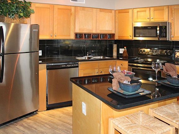 FEATURED AMENITIES. Computerized security system. Each suite has private balcony. Views of the river, lighted bridges and city skyline. In-suite washer and dryer. Doors with peepholes. Entry closet. Vertical blinds provided. Kitchen island. Granite counters and tile in the kitchen and bath. Custom-made cabinets. Microwave in every suite. Refrigerator. Dishwasher. Garbage disposal. Single closet in master bedroom. Single closet in second bedroom.