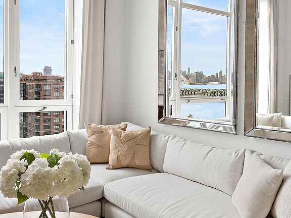 Stylish white countersEast facing penthouse loftDedicated closetsHardwood floorsDrenched in natural lightLarge common roof deckNyc and river views