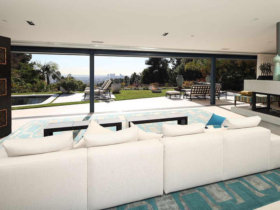 Light, bright contemporary nestled in the hills of the exclusive Trousdale Estates neighborhood with sweeping city to ocean views. Open floor plan includes spacious living room, gourmet chef's kitchen with top of the line appliances and breakfast area, dining room and media room. Three bedrooms including luxurious master with a fireplace, plus an office that can become an additional bedroom. Walls of glass open to the backyard featuring a grassy lawn, al fresco dining spaces, heated pool and spa. Luxury finishes and amenities such as a large gated motor court with parking for 6+ cars, new landscaping, updated entertainment system and stunning views complete this Trousdale gem.