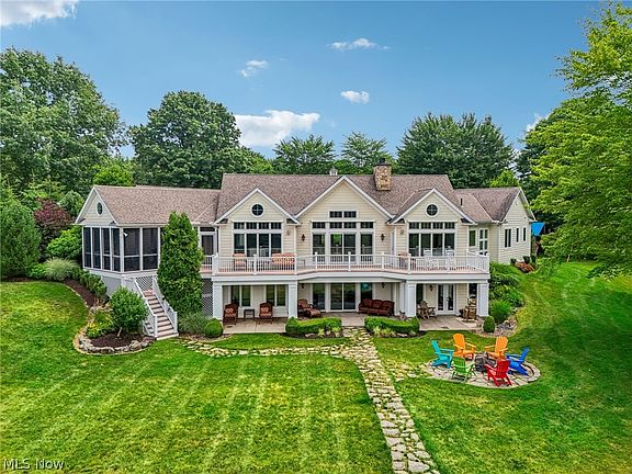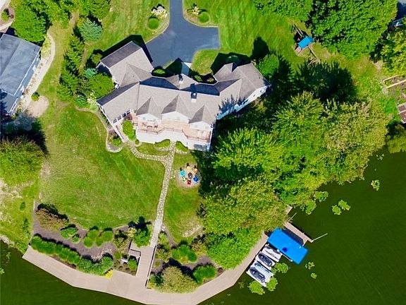 Prime lakefront location with the private Roaming Shores Lake community. Enjoy the sunsets with the western views of this unbeatable property with beautiful open lake views both north and south. High level, recent construction home with gorgeous curb appeal from both the street & lake. Large windows with amazing views throughout. Over 300' of lake frontage. Enter the double front doors into the heart of the home, a spacious vaulted great room with views through to the lake. Lovely scraped hickory hardwood flooring. Open concept to the large eat-in kitchen with granite counter including breakfast bar and center island, loads of cabinetry for storage. Access the wonderful screen porch with views on three sides and vaulted wood ceiling. Expansive deck across the front of the home with 3 power shades to provide shelter as needed. Wonderful flow throughout this home. Gracious owners' suite with high ceilings and access to the upper deck. En-suite bath with large tiled shower. Enjoy relaxing in the deep soaking tub with views over the lake. Two additional bedrooms provide great space for guests and kids and attach via the jack and jill bath with separate vanity areas. First floor laundry room and powder room. The walk-out lower level has amazing additional recreation space and room for more guests, plus a full bath and multiple storage spaces. The lower level walks out to the covered patio that leads to the rolling front lawn with welcoming firepit area. Stone steps take you to the wrap around dock along the front of the property.Multiple areas for outside enjoyment...decks, screen porch, patio, firepit, docs & a lush rolling lawn. Boat lift, jet ski docks included. Dock area is tucked into the cove for easy access. Low maintenance exterior finishes including cement board siding and composite decking. Enjoy the lake life of Roaming Shores, over 550-acre private lake, clubhouse, tennis courts, 2 pools, 2 beaches, pavilion for summer concert series, fireworks & more.