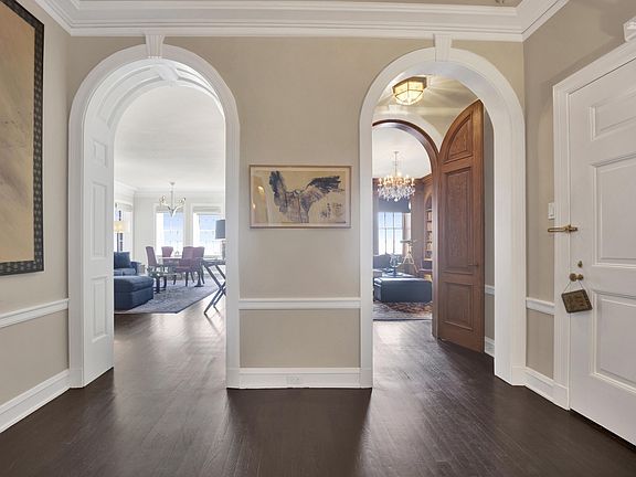 Cross the threshold into the grand foyer of this 23rd floor aerie and be dazzled by the light that suffuses this elegant residence by day from every direction. This expansive, 4000 sq ft home features 3 large bedrooms in addition to a vast library. The grand entry foyer provides an unparalleled graciousness in its dimensions and flows forth into the living room with sweeping views of Lake Michigan and the surrounding lakefront north and south. The fireplace is the focal point of this stately room, which is massive enough to afford space for multiple seating areas. The living room flows seamlessly into the vast dining room for ease of hosting celebrations. The handsome, wood-paneled library wraps itself around you in its old world aesthetic...replete with impressive vintage details and a wall of stately bookcases. The kitchen is flooded with light from windows to the north and west and has counter seating at the island for quick repasts but also offers space for a breakfast nook or eat-in kitchen table. A large butler's pantry is set up with wine and beverage refrigerators and has an abundance of counter space and elegant glass-fronted cabinets for barware. A barrel-vaulted hallway leads to the living quarters, where three bedrooms of grand proportions offer plenty of room to spread out. The second bedroom is currently serving as an office/occasional guest room and features lovely built-in bookcases and desks. The primary bedroom has 2 large walk-in closets and a sizable spa bathroom. Bedrooms two and three share a Jack-and-Jill bathroom. A third full bathroom is steps away. This exceptional Gold Coast building, designed by legendary NYC architect Rosario Candela, is celebrated for its classical proportions and architectural refinement. The white-glove service provided by the exceptional and discreet building staff is largely unmatched elsewhere. Additional amenities include an expansive fitness room and a serene garden. Parking is valet/onsite. This home has a massive storage cage on the lower level.
