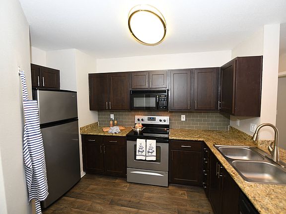 - Exterior features: 9-foot ceilings, Barbecue, Better On-Site Parking Solutions with Zark, Bicycle storage, Breakfast bar, Business Center, Flexible Rent Payment Schedule with Flex Rent, On-Site Maintenance, On-Site Management, Online service requests and status updates, Package Receiving, Pet Park, Pet friendly (breed restrictions apply), Polished granite kitchen countertops, Separate dining area, TV Lounge, Tile kitchen backsplash, Wood-style plank flooring in kitchen