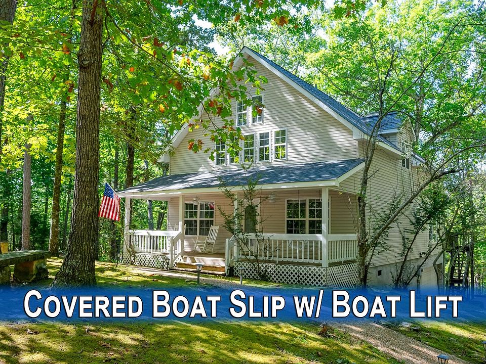 Enjoy living in an exclusive subdivision w/ community pool, our own personal covered boat slip & boat lift in marina, manicured streets, plus community boat ramp. Open & spacious home with a welcoming & relaxing style. Great room offers full size windows to enjoy the changes of the seasons & nature watching. Kitchen makeover approx. 2 years ago included granite countertops, stainless appliances, painted cabinets & hardware, plus kitchen sink hardware. 3 spacious bedrooms, 2 bathrooms, both w/ granite countertops. Large wrap around deck. Covered front porch is perfect to relax on while watching wildlife forage. Garage with storage room. Concrete driveway with plenty of parking space. Roof is approx. 2 years old. Take the 3-D virtual tour or watch the drone video to see more.