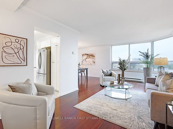 Welcome to the sought-after St. Tropez! This 1,279 sq. ft. suite (per builders plan) is perched just above the treetops, offering both north-west and east-facing views that flood the space with natural light. Featuring gleaming hardwood floors throughout and timeless tile accents, this home combines style and comfort. The updated eat-in kitchen is perfect for everyday living, while the spacious L-shaped living and dining room is ideal for entertaining or relaxing in style. Residents enjoy year-round recreation facilities - Club Riviera, a 24/7 gatehouse security for peace of mind, and an unbeatable location close to major transit routes, the train station, LRT, and shopping. This is more than a condo it's a lifestyle. Once you visit, you'll want to call it home. Be sure to admire the most picturesque landscaping. NOTE: One blind in the kitchen is not functioning.
