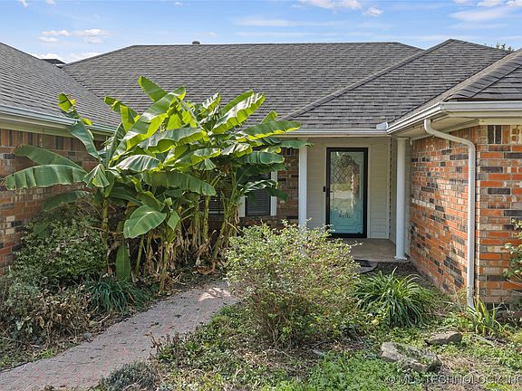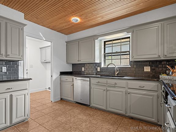 Mature shade treesShiplap ceilingFenced in backyardBrick homeFruit treesExtended garden flowerbedsSolid surface black granite