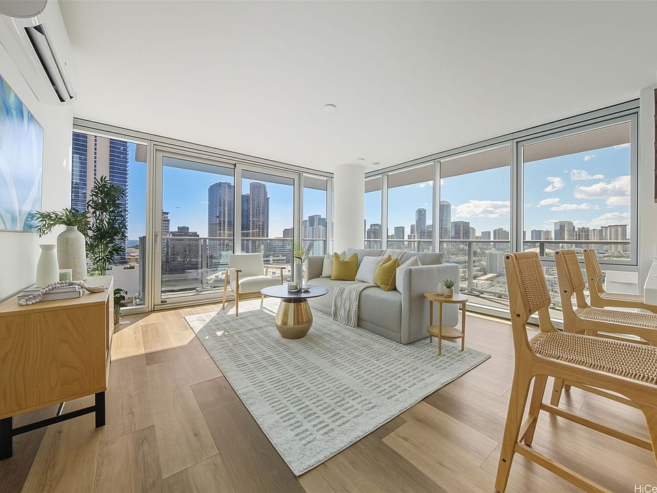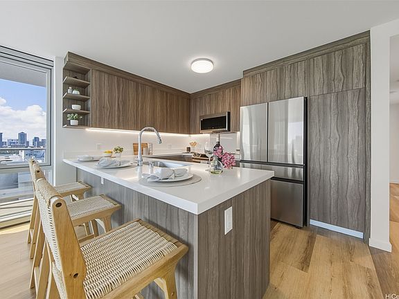 Brand-new, never-lived-in 2-bedroom, 2-bath corner unit with a wraparound lanai offering 180-degree views of the city, mountains, and ocean. Features luxury vinyl plank flooring throughout (no carpet), an open kitchen with a large counter-bar, soft-close cabinets, stainless steel appliances, quartz counter tops, and more. Split A/C in every room, a primary bedroom with a walk-in closet, a primary bathroom with a walk-in shower, and a dedicated laundry room. Includes two side-by-side parking stalls on level 4, conveniently located near the building entrance. Enjoy resort-style amenities with an infinity pool and whirlpool overlooking the city skyline, private BBQ pavilions, movie theater, indoor fitness center, yoga studio, sauna room, playground, dog park, and an elegant clubroom for private gatherings. Conveniently and centrally located, ideally situated in a walkable neighborhood with premier shopping, dining, and entertainment at nearby Ala Moana Center. On-site retail and a new international food court are coming to the building, adding even more convenience.