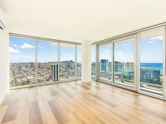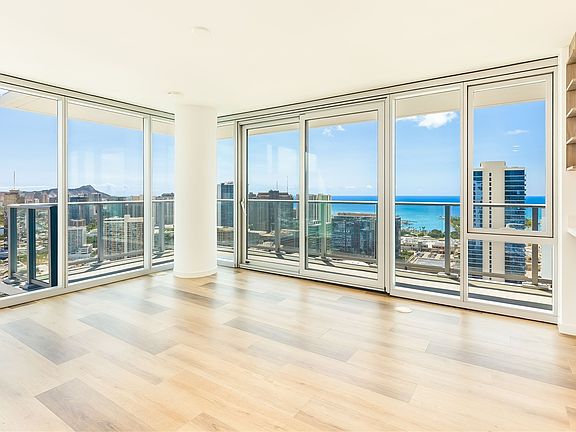 Experience this premium corner residence in the preferred Rycroft Tower showcasing stunning ocean and Diamond Head views. Floor -to-ceiling windows flood the home with natural light, while a quiet split AC system ensures year-round comfort. The expansive layout is complemented by a warp-around private lanai, offering the perfect retreat for relaxation or entertaining. This unit also features upgraded luxury vinyl plank flooring in both bedrooms, quartz countertops, stainless steel appliances, and in in-unit washer and dryer. Residents enjoy access to an unrivaled resort-style amenity deck, featuring massive infinity pool and spa, a plethora of private BBQ pavilions, movie theater, co-working and media rooms, spectacular party rooms, and a fitness center with yoga room and sauna. Additional conveniences include secured covered parking, over 25 EV charging stations, bike storage, and 24/7 security. This pet-friendly community blends modern design with lifestyle convenience in one of Honolulu's urban neighborhoods.