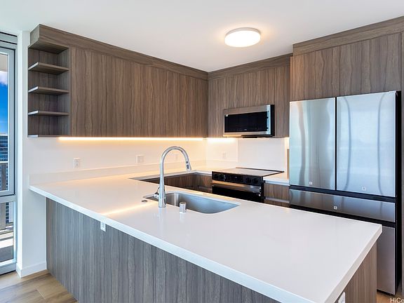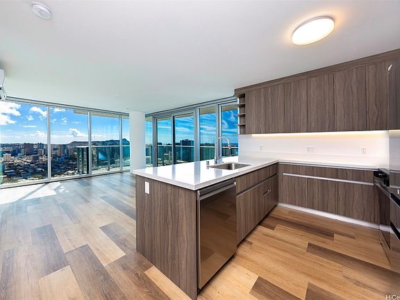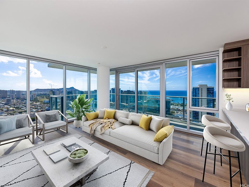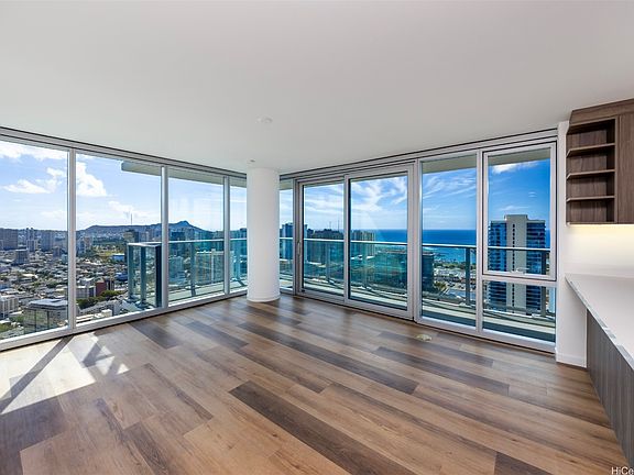 The Park on Keeaumoku is Honolulu's newest high-rise destination, just completed in Q4 2025. This high-floor, front-corner 2-bedroom, 2-bath residence situated on the 43rd floor of the Rycroft tower enjoys stunning Diamond Head, Pacific Ocean, and urban Honolulu views from the main living areas, wrap-around lanai, and both bedrooms. Features include a contemporary kitchen with quartz countertops, stainless appliances, and built-in bar seating, luxury vinyl plank flooring, modern fixtures, plus a primary bedroom with a walk-in closet and double-vanity ensuite bath. Enjoy on-site resort amenities including an infinity-edge pool and hot tub, ample pool seating and cabanas, multiple open and covered barbecue pavilions, an exercise gym, yoga studio, meeting room, movie theater, co-working space, and much more. Exceptional island living meets unforgettable views - welcome home to The Park on Keeaumoku #4319R. Listing includes enhanced, virtually staged photos.