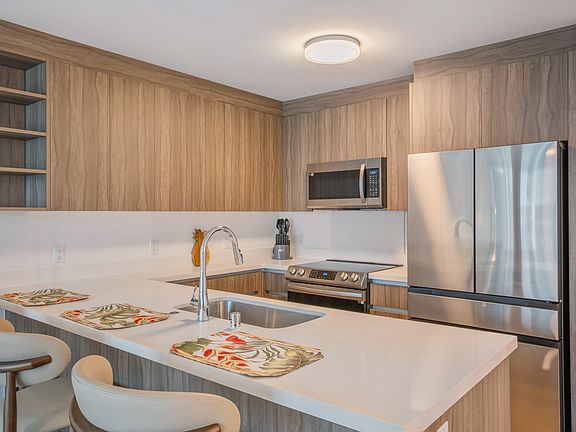 Modern Fully Equipped Kitchen: Cook/entertain in style with a sleek kitchen featuring quartz countertops, upscale appliances (refrigerator, dishwasher, microwave), and all essential kitchen supplies (dishes, glassware, silverware, cookware, utensils, coffee maker, rice pot) provided.