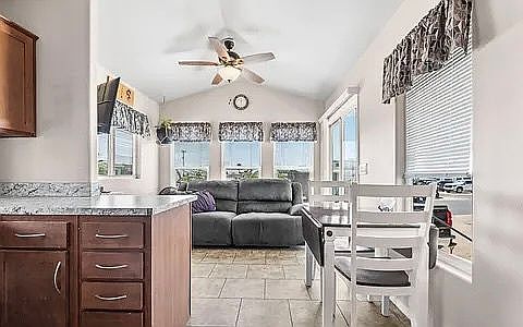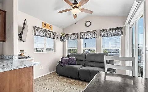 • Bright open living room with vaulted ceilings & ceiling fan