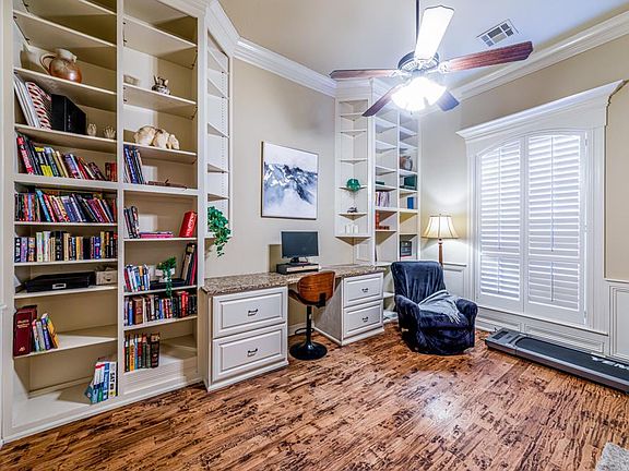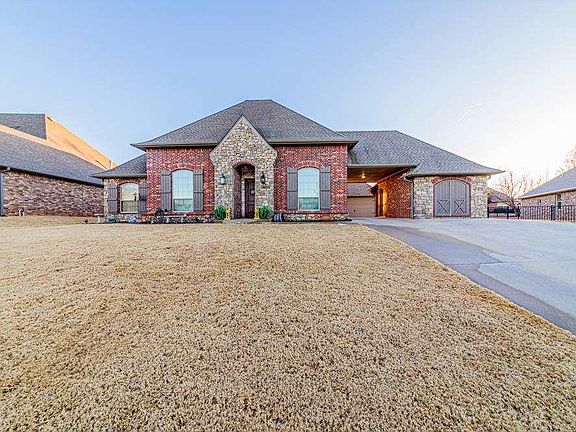 PRICE REDUCED. Step into elegance and comfort with this stunning 4-bedroom home, with a dedicated office, nestled in the highly sought-after Berry Creek neighborhood. With a timeless brick and stone façade, this residence boasts a porte cochere-style third-car garage, adding to its distinct charm and curb appeal. Inside, the open floor plan seamlessly connects a spacious dining and living area to a well-appointed kitchen, making meal prep and entertaining effortless. The kitchen features stylish light cabinetry, stainless steel appliances, a walk-in pantry, and a large eating bar, creating a bright and welcoming space. The living area, with its rich hardwood floors and cozy stone fireplace, exudes warmth and sophistication. Recently refreshed with a new coat of paint in the living/dining area, hallway, two bedrooms, and secondary bathroom, the home has an enhanced sense of brightness and charm. For those working from home, a dedicated office awaits, complete with soaring ceilings, elegant French doors, crown molding, hardwood floors, and built-in storage. The private primary suite is a wonderful retreat, featuring a spa-like bath with separate vanities, a tiled walk-in shower, a jetted tub, and a spacious walk-in closet. The split-bedroom floor plan ensures privacy, with three generously sized secondary bedrooms featuring large closets, providing comfortable accommodations for family or guests. A favorite highlight of the home is the screened-in patio, offering a seamless blend of indoor and outdoor living—perfect for enjoying seasonal breezes in comfort. Additional features include a spacious laundry room, a convenient mudroom, a half bath, and a storm shelter in the garage, enhancing the home's practicality and security. Residents of Berry Creek enjoy access to a community pool, clubhouse, and playground. The pool provides a refreshing retreat during summer days, while the clubhouse serves as a great venue for gatherings. The playground offers a lively space for children to play, contributing to the neighborhood’s welcoming and vibrant atmosphere. This home is a must-see! Schedule your private tour today and experience the charm and elegance of Berry Creek living.